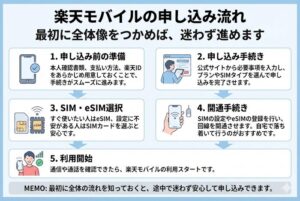 この章では、楽天モバイルの申し込みをスタートしてから、実際に使い始めるまでの流れを、ざっくり分かりやすく整理します。