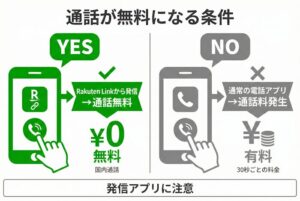 まずは「通話無料=Rakuten Linkを使う」と覚えておくと分かりやすいですね。