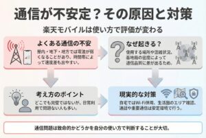 この記事では、楽天モバイルの問題点を正直に整理しながら、どんな人に向いているのか、逆にやめたほうがいい人はどんなタイプかを丁寧に解説します。