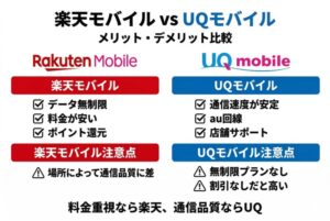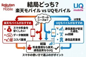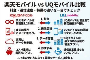 楽天モバイルとUQモバイルを比較すると、それぞれ強みが違うことが分かります。